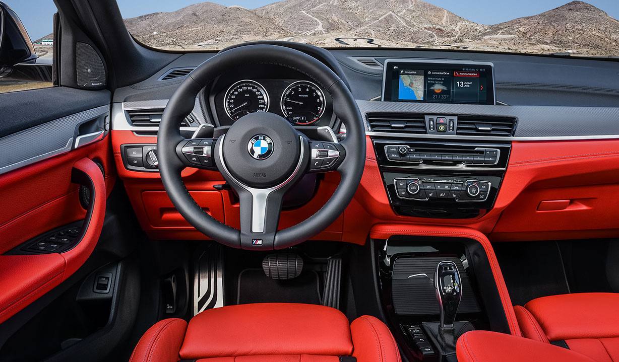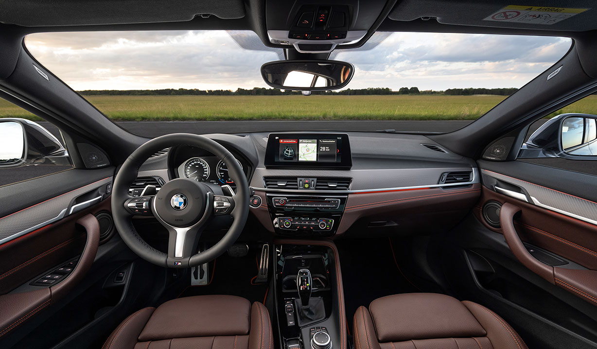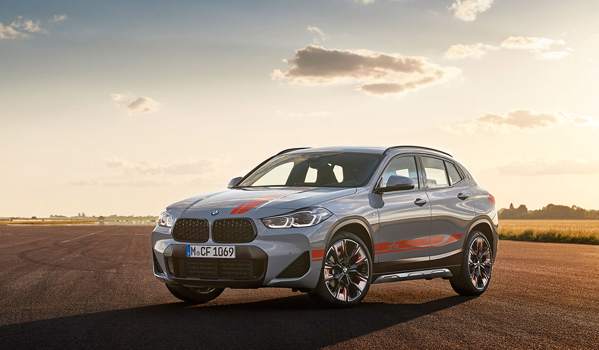 Fesselnd auf den ersten Blick: Der BMW X2 in der Edition M Mesh sorgt mit exklusiven Designelementen für einen extrem sportlichen undstilvollen Auftritt. Mit seiner Lackierung in Brooklyn Grau metallic und einer Vielzahl an Design-Highlights wie der imposanten BMW Niere in Mesh-Optik zieht er die Aufmerksamkeit mit Leichtigkeit auf sich. Im Interieur unterstreichen exklusive Ausstattungen wie die M Sportsitze für Fahrer und Beifahrer in Leder ‚Dakota‘ Mokka-/Alcantarakombination mit orangenen Ziernähten, die M Fahrerfußstütze, Fußmatten mit orangem Einfassband und die M Pedalerie das sportliche Ambiente und den echten Premiumcharakter.